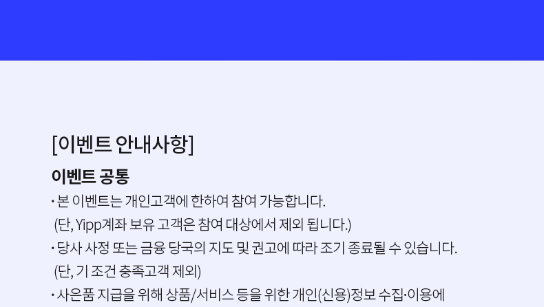 - 본 이벤트는 개인고객에 한하여 참여 가능합니다.(단, Yipp계좌 혜택 고객은 참여 대상에서 제외 됩니다.)