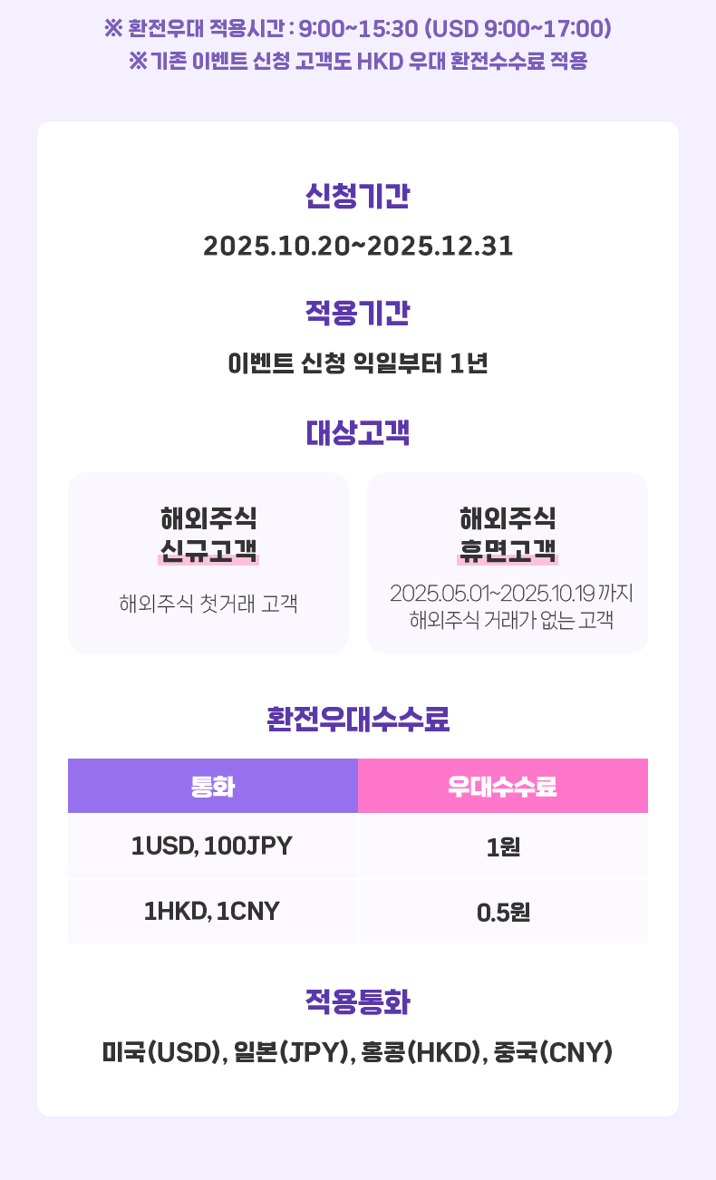 - 본 이벤트는 해외주식 거래시 발생하는 환전수수료 부담을 덜어드리고자 진행하는 이벤트로 환차익 목적의 반복환전으로 판단 될 경우, 당사의 판단에 따라 환전혜택이 제한될 수 있습니다.