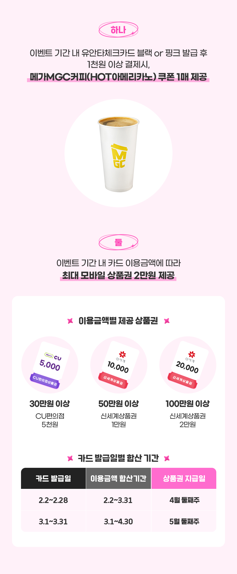 하나. 이벤트 기간 내 유안타체크카드 블랙 or 핑크 발급 후 1천원 이상 결제시, 메가MGC커피(HOT아케리카노) 쿠폰 1매 제공
