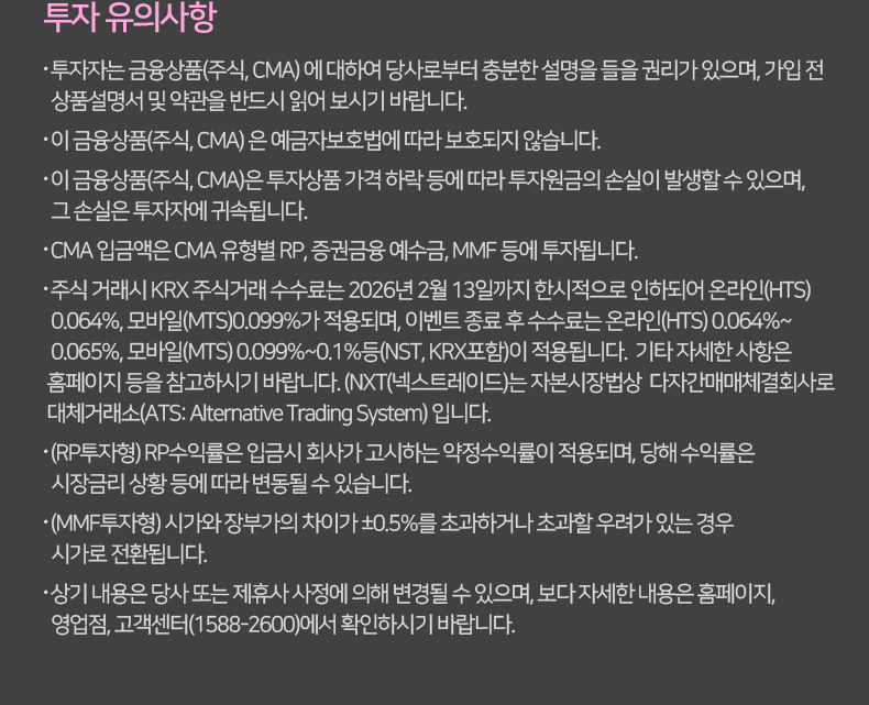 - 주식 거래시 KRX 주식거래 수수료는 2026년 2월 13일까지 한시적으로 인하되어 온라인(HTS)0.064%, 모바일(MTS)0.099%가 적용되며, 이벤트 종료 후 수수료는 온라인(HTS) 0.064%~0.065%, 모바일(MTS) 0.099%~0.1%등(NST, KRX포함)이 적용됩니다. 기타 자세한 사항은 홈페이지 등을 참고하시기 바랍니다. (NXT(넥스트레이드)는 자본시장법상 다자간매매체결회사로 대체거래소(ATS: Alternative Trading System) 입니다.