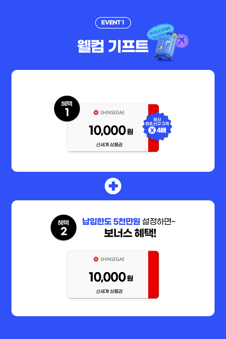 - 혜택1. SHINSEGAE 10,000원 신세계 상품권. 당사 최초 신규 고객 ×4배