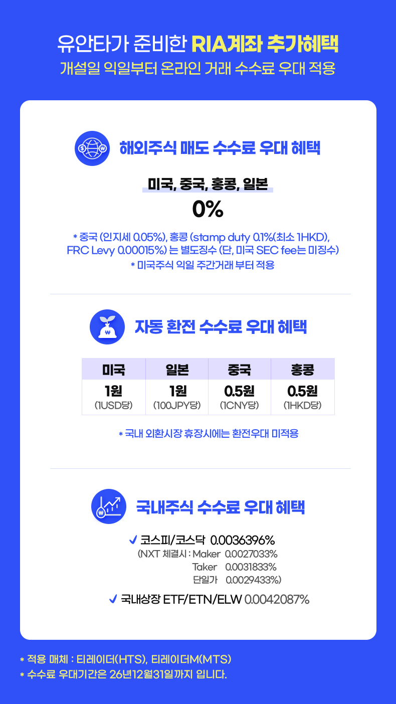 - 해외주식 매도시 제비용이 별도 부과됩니다. [상해A/심천A 0.05%, 홍콩 Stamp Duty 0.1%(최소 1HKD)&FRC Levy 0.00015%(소수점 셋째자리에서 반올림하여 최소 0.01HKD), 대만 0.3%(Day Trading 0.15%/ETF 0.1%), 2026년 4월 2일부터 미국 SEC fee 0.00206%, 일본은 제비용 없음] 단, 미국주식은 당사가 정한 기준에 따라 RIA계좌에서 매도 시 미국주식 제비용 무료 혜택이 적용됩니다.