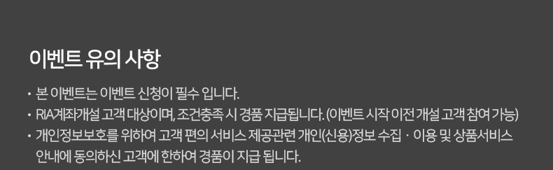 - RIA계좌개설 고객 대상이며, 조건충족 시 경품 지급됩니다. (이벤트 시작 이전 개설 고객 참여 가능)